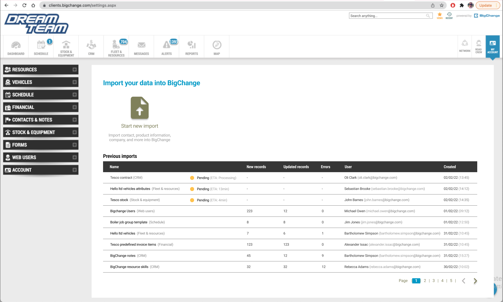 When new to BigChange businesses must import a lot of data. Previously there was no easy way to do this from a single place, and the functionality had a number of usability issues. It can sometimes be difficult to be sure that everything has worked as expected or to understand what to do if something has gone wrong. Common pain points such as not knowing the statuses of each import and not knowing if information in the file are formatted corrected would often occur. Before the Import Hub, users would have to individually go into the section of the information that they want to import and select it from there. For example, Admin > Resource > Vehicles > Import.