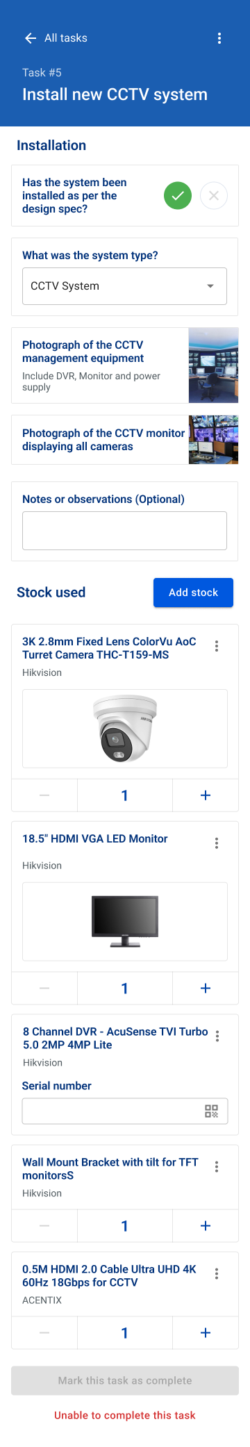 Added a section for stocks and non serialised items that are going to be used for the job. Straightforward UI of how each item can be added and editing its quantities.