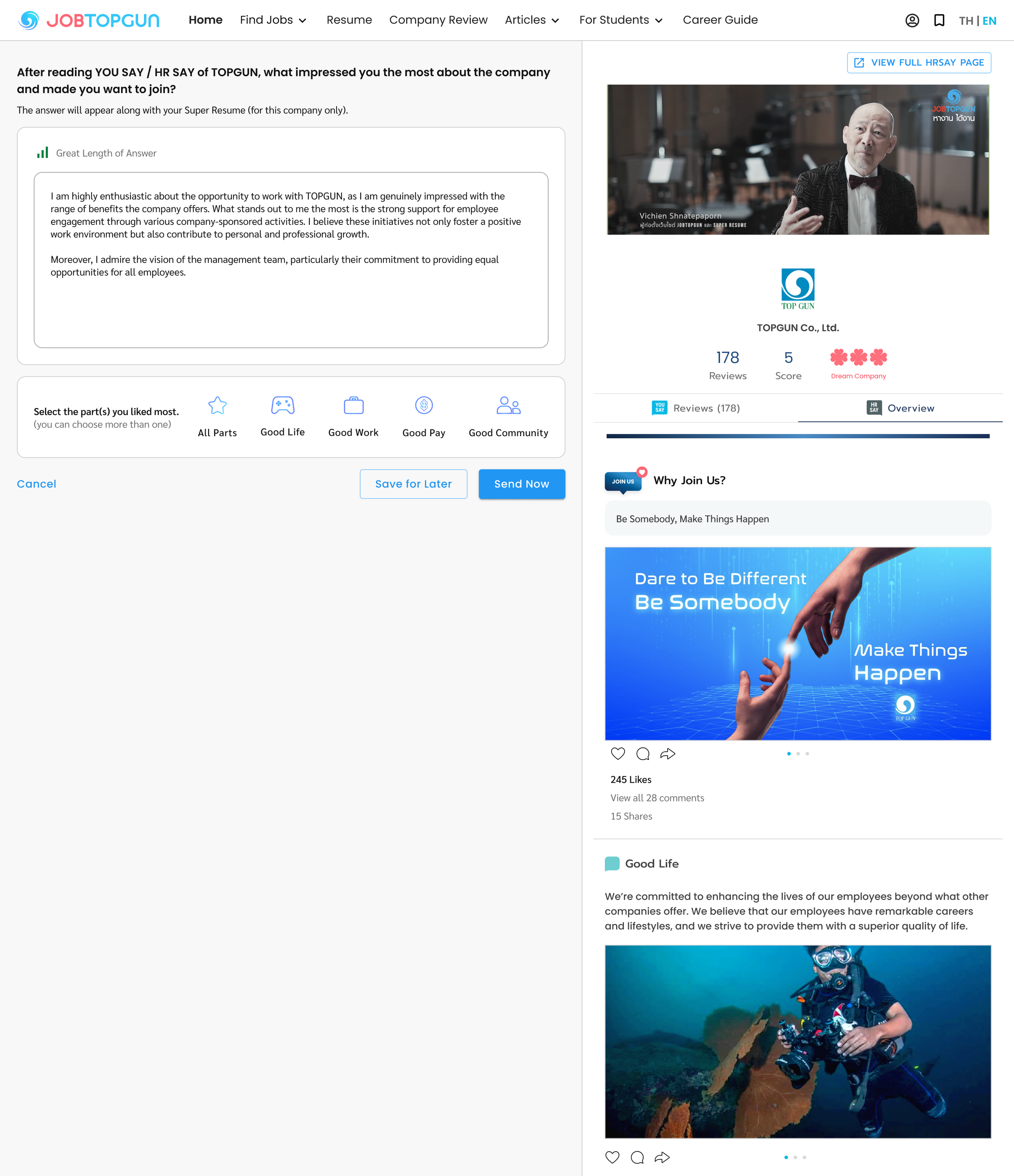 Personalized Application Experience: After submitting an application, job seekers are directed to the company’s HR SAY page, where they engage with the company's culture and values. By answering the question, "Why do you want to join this company?" job seekers personalize their applications, making them stand out to HR professionals.